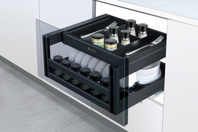→ 設(shè)計:標(biāo)配星徽阻尼滑軌,開合順滑流暢、靜音自動回位; 抽中抽多層收納結(jié)構(gòu)提升立體空間使用率,同時可移動式碗碟架,方便清潔衛(wèi)生或靈活使用。